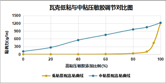 随着高粘比例增加,粘着力上升缓慢,但当高粘达到一定比例时,粘着力会突然跃升(下图高粘添加量为90%时,粘着力由100g/in跃升至1000g/in以上)。KCC金刚化工集团推出的中粘压敏胶KCC® PSA SG6320A (~200g/in),调节曲线趋近线性,从而使粘着力的调配操作更加稳定精准。