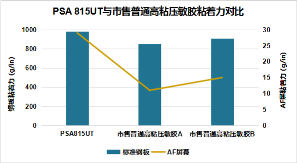 在水滴角为117°的AF屏上,防指纹屏保护膜的有机硅压敏胶KCC®SG6750A的即测粘着力可达到30g/in,明显高于市售高粘压敏胶。